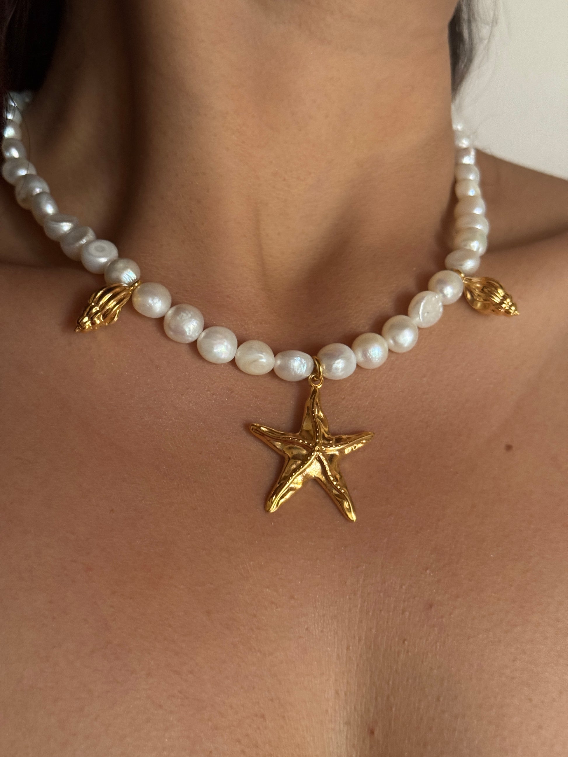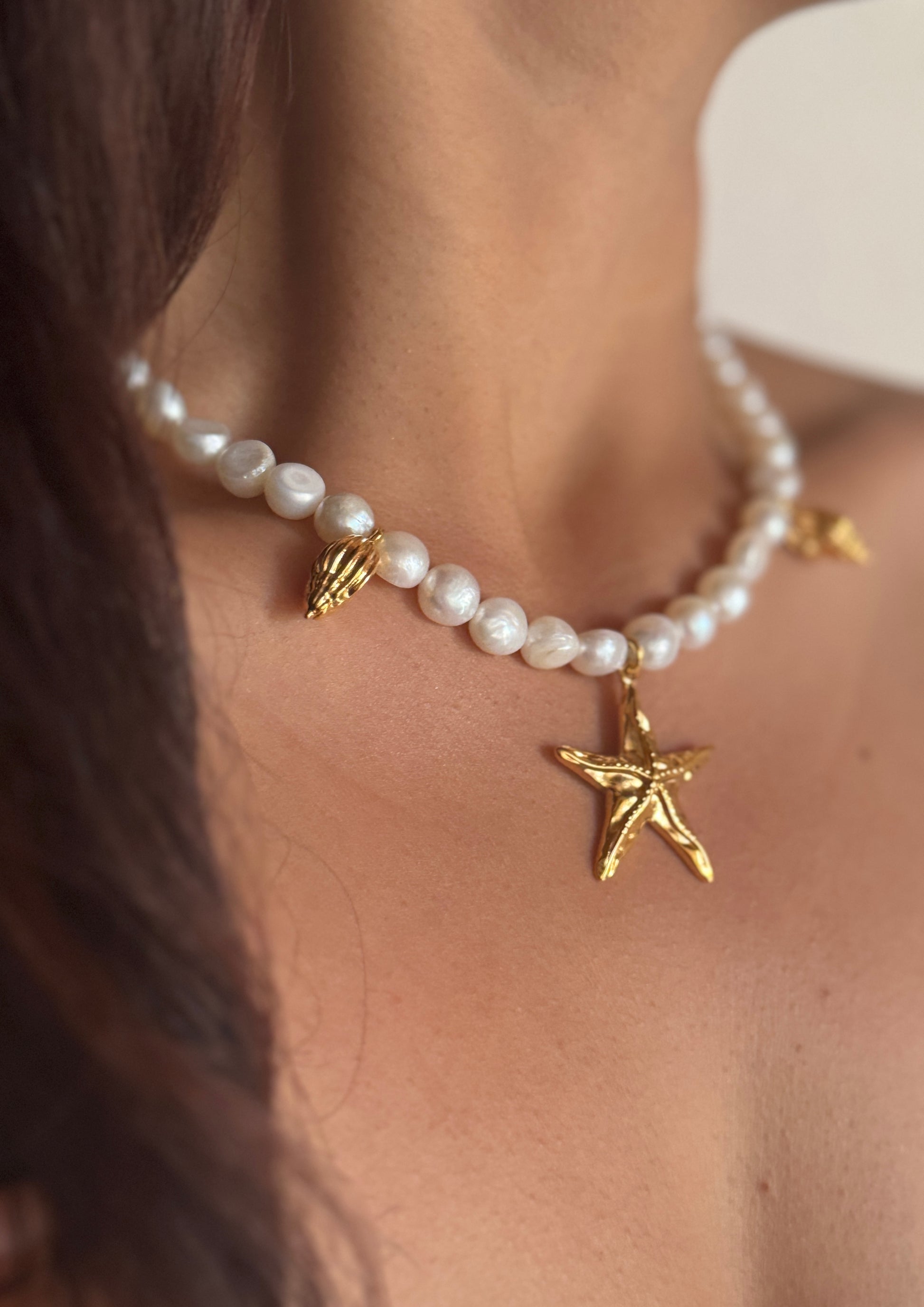 With a starfish at its center and seashells by its side, this necklace carries the essence of the mermaid: intuitive, untamed, and forever drawn to the depths.